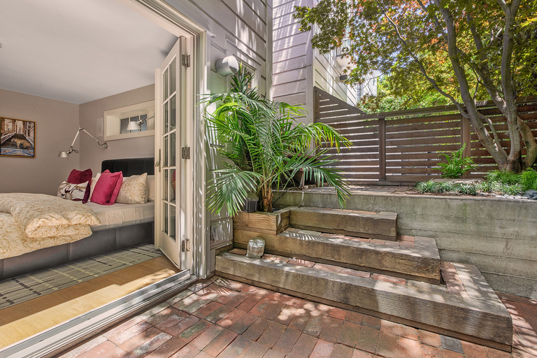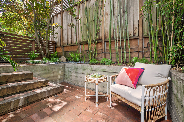Previously bare and neglected, we made the few mature plants already there into focal points, while bringing in an array of super verdant and shade-loving plants to complement. A good scrub and a comfy spot to hang complete the space.